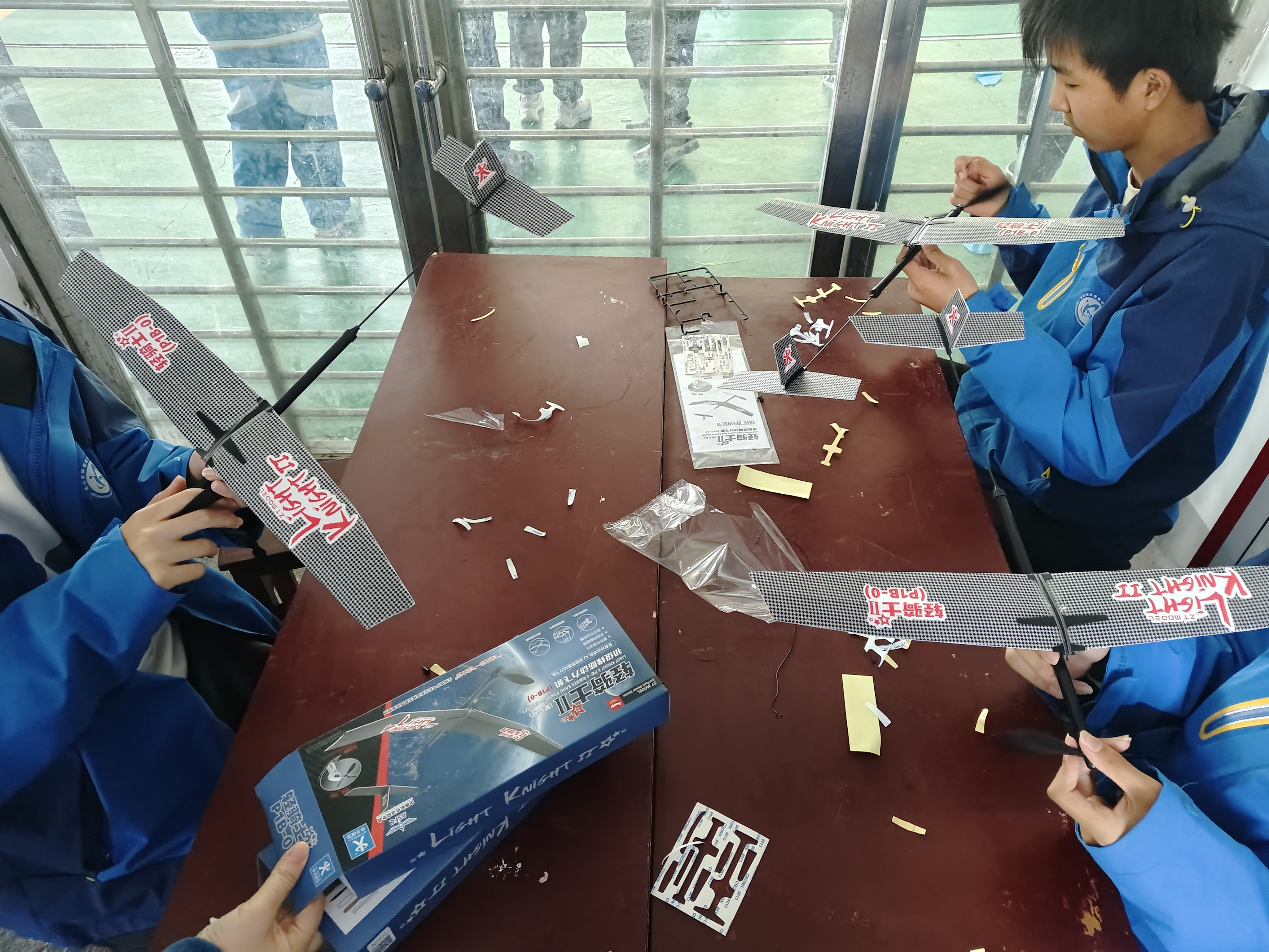 11月7日,第四屆小小愛飛客航模競賽正在激烈進行,坪壩中學(xué)航模隊參加了橡皮筋動力滑翔機比賽,隊員們?nèi)褙炞⒌剡M行著組裝工作?! ≡诠ぷ髋_前,隊員們熟練地拿起橡皮筋,并將其安裝到位,確保動力傳輸?shù)姆€(wěn)