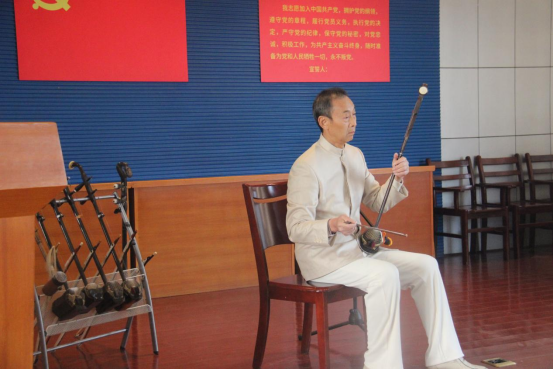 講座尾聲,現(xiàn)場氛圍迎來高潮。車定祥親自操琴,并邀請京山五中音樂老師文婷、熊元聯(lián)袂呈現(xiàn)經(jīng)典曲目《敖包相會》。兩位老師以深情婉轉(zhuǎn)的男女對唱勾勒出草原相會的浪漫意境,車定祥的胡琴伴奏則以清亮悠揚(yáng)的音色穿插其間,琴弦流轉(zhuǎn)間既呼應(yīng)了歌曲中“胡琴聲聲回蕩”的意象,又以細(xì)膩的演奏技巧為旋律增添了濃郁的民族風(fēng)情。歌聲與琴音相得益彰、默契交融,婉轉(zhuǎn)旋律穿透會場直抵人心,贏得師生們經(jīng)久不息的熱烈掌聲。