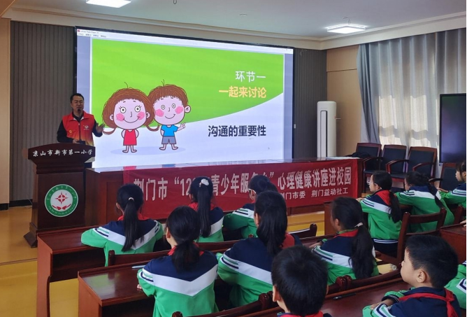 11月23日上午,新市第一小學(xué)邀請(qǐng)荊門市益動(dòng)社工為五年級(jí)學(xué)生開展了以“良好的溝通”為主題的“12355青少年服務(wù)臺(tái)”心理健康公益講座。課堂伊始,志愿者講師通過講故事與播放視頻的方式,吸引同學(xué)們?nèi)谌胝n堂