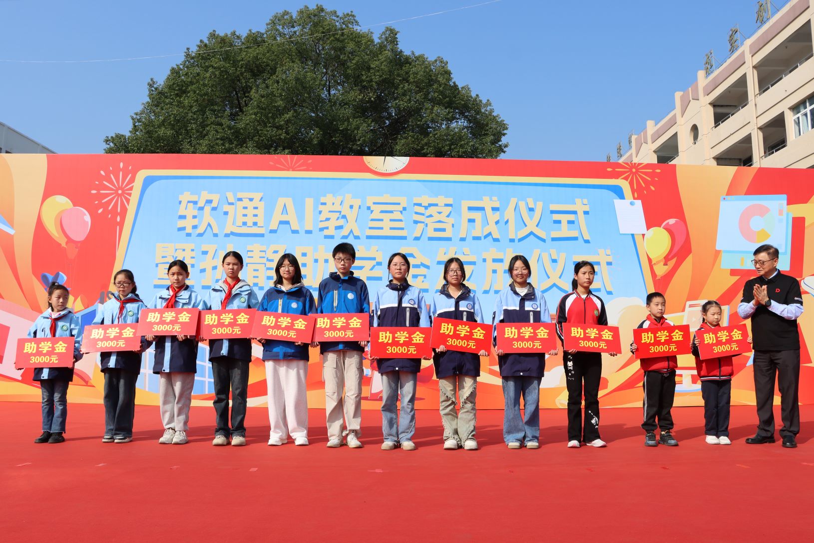活動(dòng)現(xiàn)場為59名優(yōu)秀學(xué)生、16名優(yōu)秀教師和先進(jìn)教師、12名受助學(xué)生發(fā)放孫靜助學(xué)金共計(jì)10萬元。坪壩鎮(zhèn)初級中學(xué)和坪壩鎮(zhèn)中心小學(xué)向軟通動(dòng)力集團(tuán)回贈(zèng)牌匾。