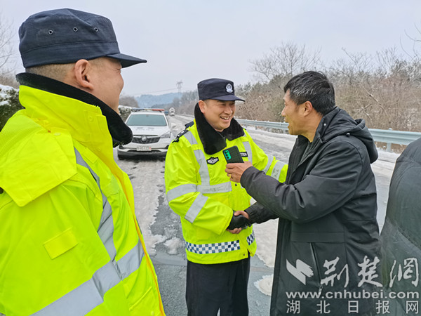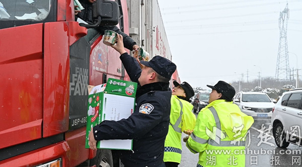 在永興、三陽等高速出入口,京山市公安局沿線派出所民輔警也為司乘朋友們送上熱水及物資,在守護平安的道路上,將愛心與善意澆灌在京山熱土上,生生不息。