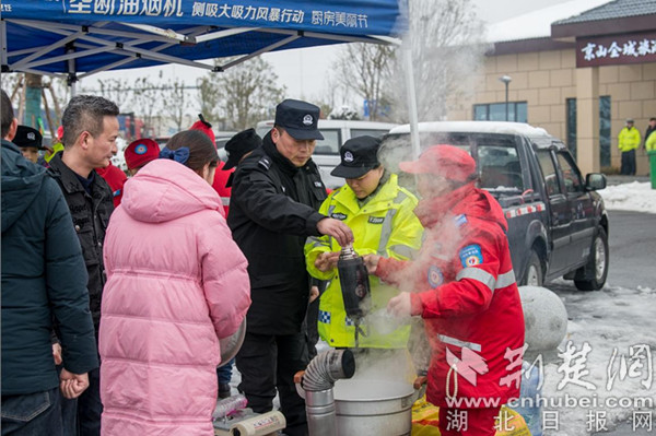 6日上午,為配合滬蓉高速京山南入口的疏散工作,京山市公安局、承楓義警隊聯(lián)合市酒店協(xié)會攜手開展“暖冬行動”,為滯留旅客們提供免費熱水及送餐服務(wù)。