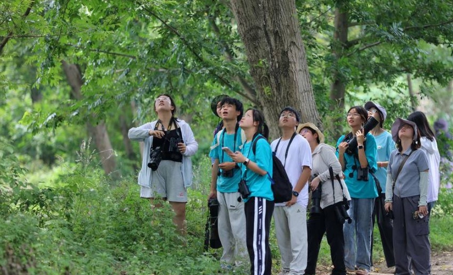 一群大學(xué)生在京山觀鳥(niǎo)賞鳥(niǎo)攝鳥(niǎo) (黃小明/攝)