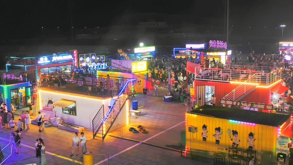 今年6月,獨(dú)具特色的集裝箱集市驚艷亮相,順利開街。夜幕降臨后,在霓虹燈照射下,17個(gè)集裝箱顏色鮮艷,錯(cuò)落擺放,設(shè)計(jì)感十足,該集市由美食區(qū)、休閑街區(qū)、公益地?cái)倕^(qū)、游樂區(qū)等4個(gè)區(qū)域和網(wǎng)球大舞臺(tái)組成,共有15家餐飲店、9個(gè)游樂項(xiàng)目和145個(gè)攤位??旧枴⒅ナ坑衩?、手工檸檬茶等美食飲品應(yīng)有盡有,旋轉(zhuǎn)木馬、碰碰車等項(xiàng)目吸引兒童爭相體驗(yàn),網(wǎng)球大舞臺(tái)為市民提供才藝展示的平臺(tái)。