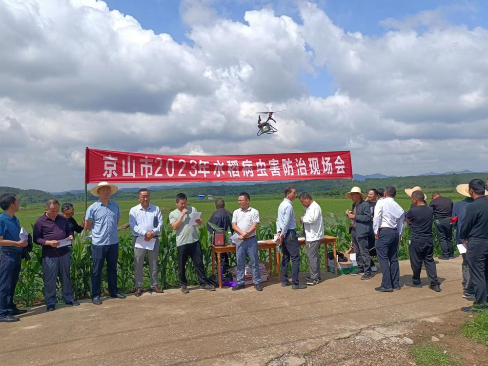 裝藥、按動(dòng)遙控器、控制飛機(jī)勻速飛行、開(kāi)始噴灑作業(yè)。5月24日上午,在宋河鎮(zhèn)同升村舉行的京山市2023年水稻病蟲(chóng)害防治現(xiàn)場(chǎng)會(huì)現(xiàn)場(chǎng),植保無(wú)人機(jī)正在給同升村新插的一片秧田示范噴灑農(nóng)作物。(水稻病蟲(chóng)害防治