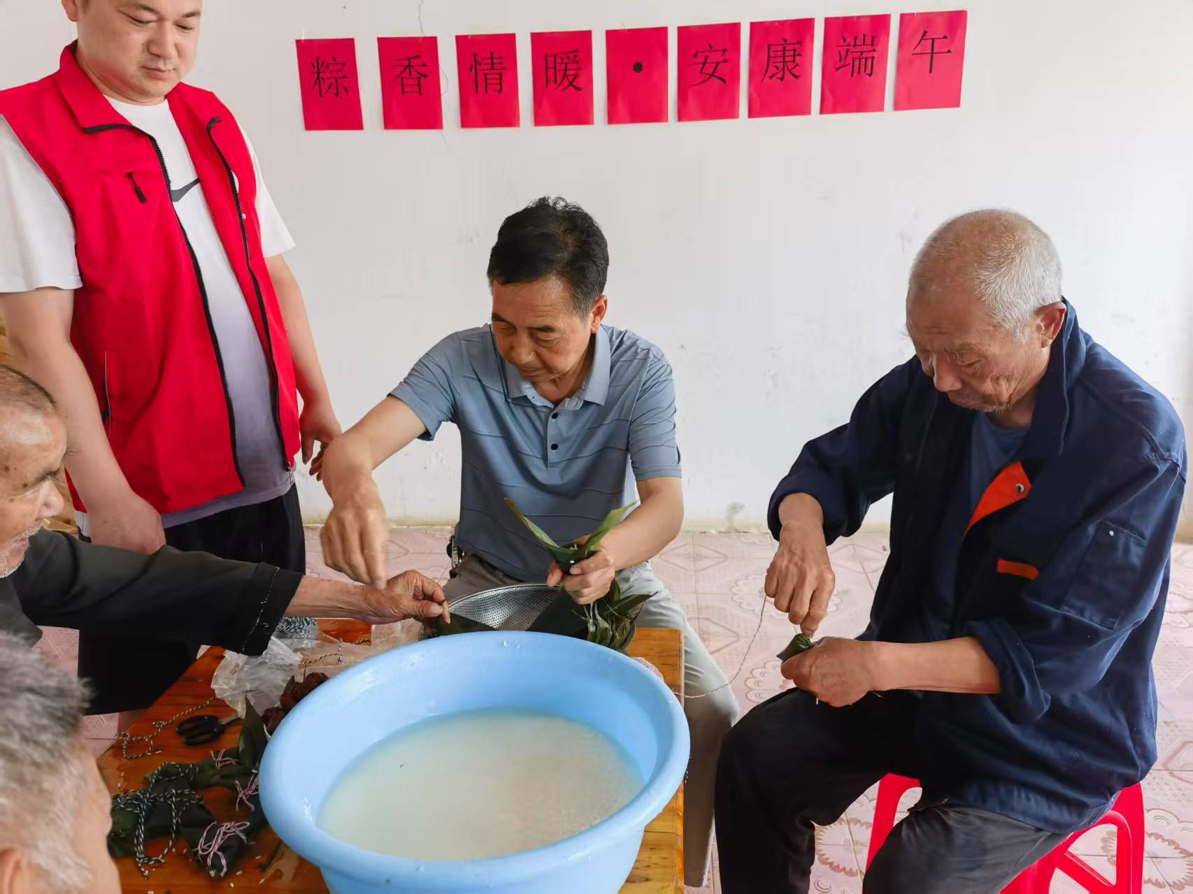 活動(dòng)當(dāng)天,社工與志愿者們?cè)缭绲诌_(dá)福利院,與工作人員一起布置場(chǎng)地,準(zhǔn)備包粽子的材料。糯米、粽葉、紅棗、紅豆等食材整齊擺放,現(xiàn)場(chǎng)洋溢著濃濃的節(jié)日氛圍。