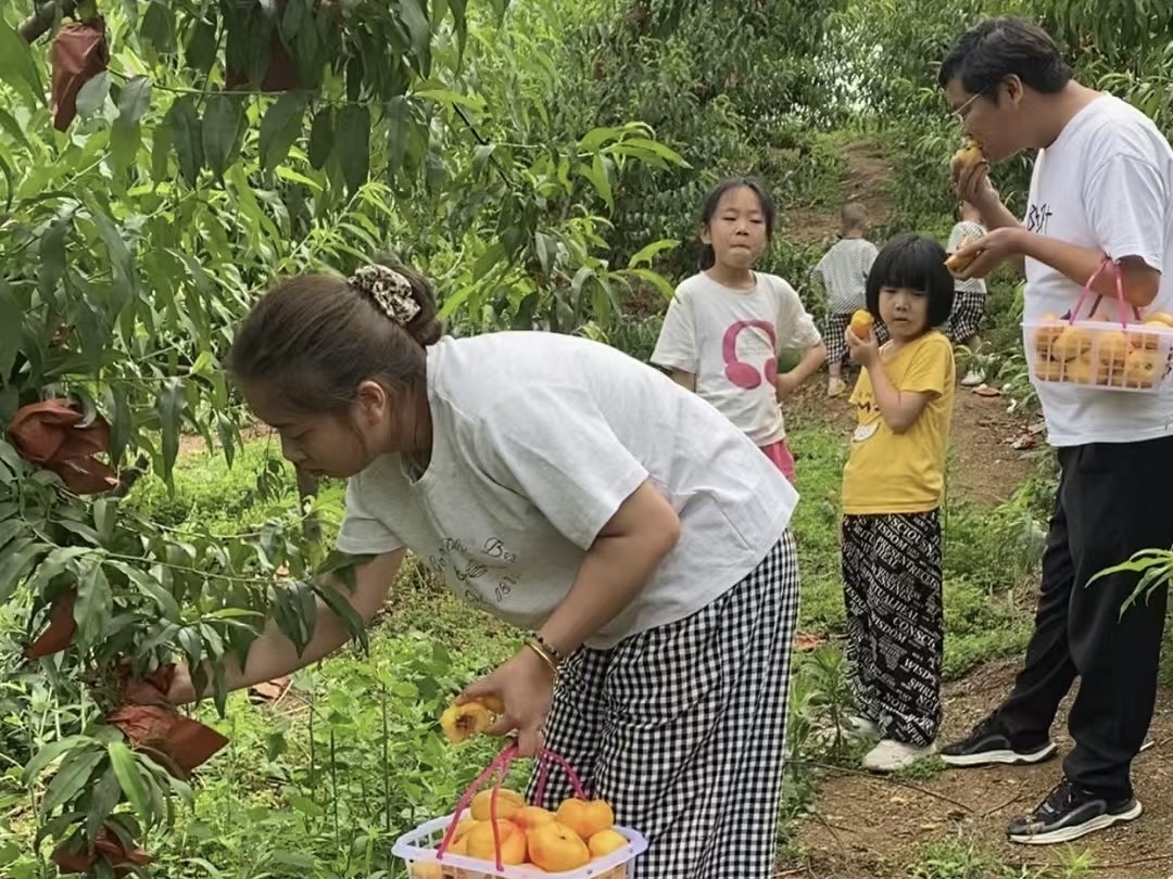 “3月份桃花盛開,今年五月末最早的油蟠桃已成熟,油蟠桃果肉細膩、口感香甜?,F(xiàn)在每天都有城區(qū)市民、游客來此采摘,盡享田園時光。此外,我們還有杏子、李子、南方櫻桃、桑葚及車?yán)遄拥榷鄠€品種水果?!卑俸锨f園負責(zé)人說道。