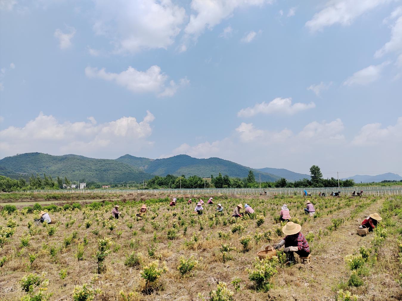眼下,新市街道荷花堰村的30畝金銀花正值花開,空氣中彌漫著淡淡的金銀花香,村民們則提著籃子穿梭于花海中,熟練地采摘著金銀花,一派忙碌的豐收景象。