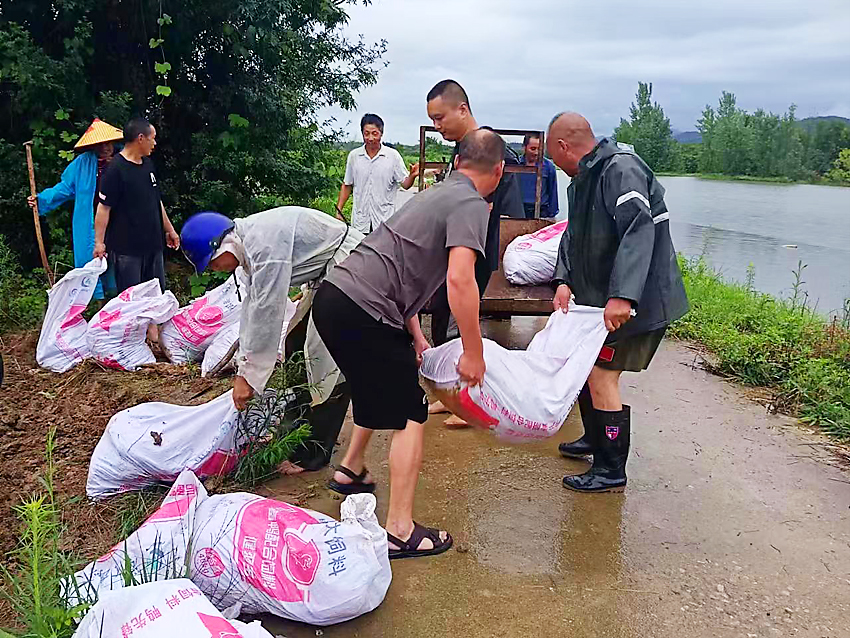 “還有雨下,大家加把勁兒,多裝土袋,趕快把堤筑起來,讓水順溝走……”7月14日早上6點,新市街道丁家塝村黨支部書記胡海濤正在組織黨員、群眾清理主河道,裝袋固堤,開展防汛自救工作。