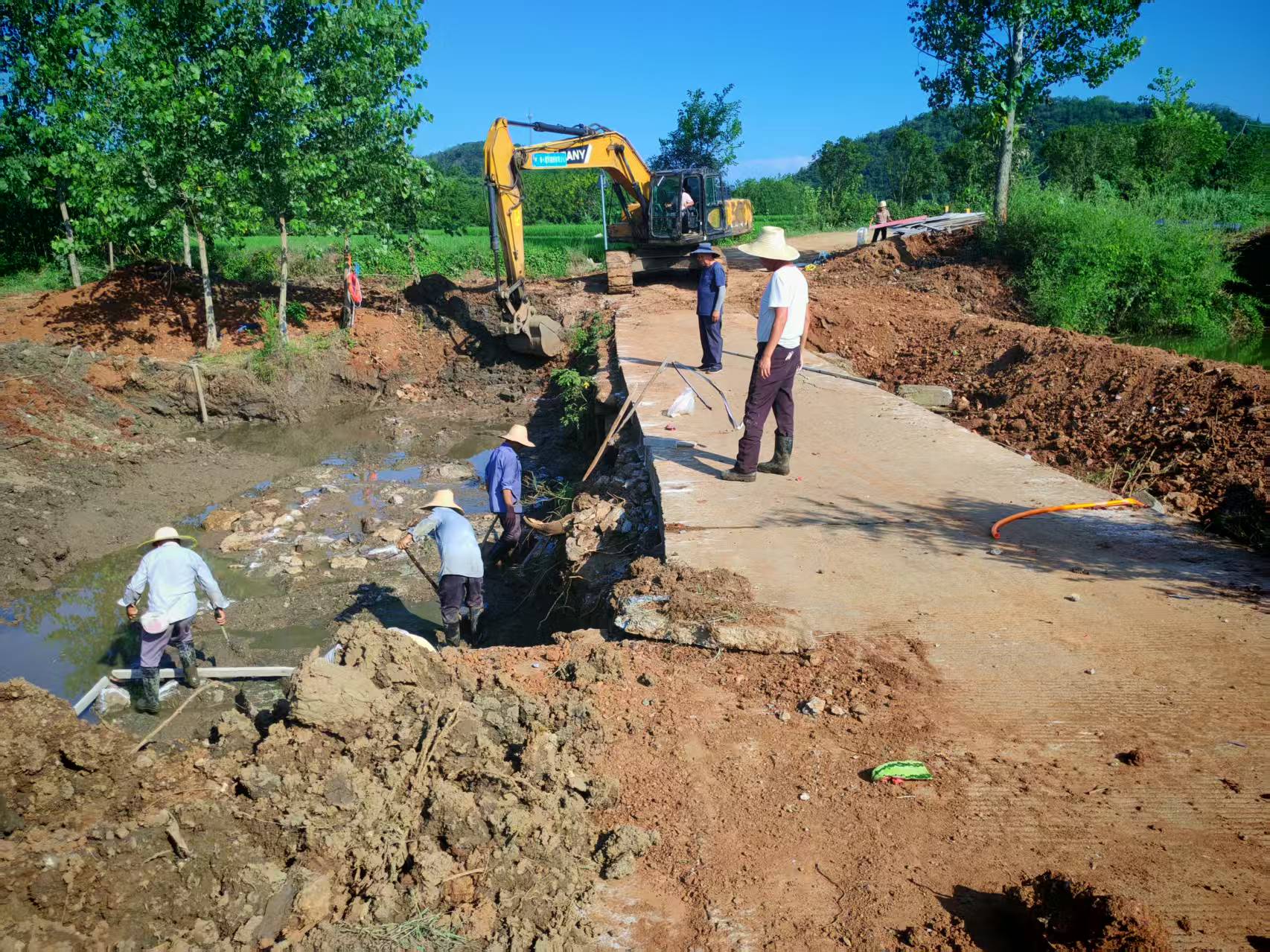 7月14日,在永興街道汀河村鄭灣橋加寬加固工程現(xiàn)場(chǎng),施工人員和熱心村民正頂著烈日進(jìn)行渠底硬化、橋墩加固。