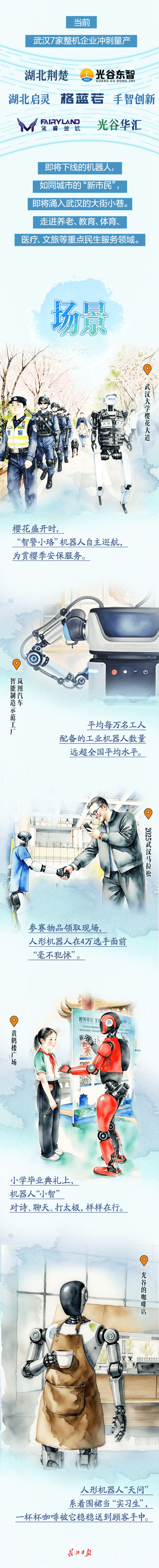 嵐圖汽車智能制造示范工廠里,平均每萬名工人配備的工業(yè)機器人數(shù)量遠(yuǎn)超全國平均水平;武漢大學(xué)櫻花大道、武漢馬拉松參賽物品領(lǐng)取現(xiàn)場,機器人“見多識廣”;在養(yǎng)老機構(gòu)里陪老人聊天、下棋,在燕磯長江大橋走上貓道“打卡通關(guān)”,在黃石的礦山開采、倉儲物流等場景,機器人將被深度應(yīng)用……