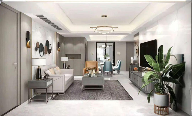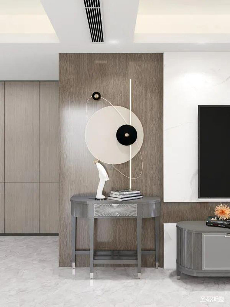 ▲設(shè)計師巧妙的運用填充藝術(shù),將客廳電視與沙發(fā)背景色彩相呼應(yīng),利用凹凸互補的設(shè)計手法,傳遞著空間時尚。莫蘭迪實木家具,配以同色系的高級金屬底座,將精致輕奢從細節(jié)中脫穎而出。