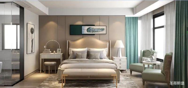 ▲次臥空間主要是以淺色為底調(diào),大面積的莫蘭迪色與淺色相平衡。極強線性裝飾畫帶來的延伸感讓視覺煥然一新。少許的金屬元素攝入,瞬間提升了空間的精致度,將溫潤雅致與時尚輕奢糅合在同一空間里,每一處都洋溢著浪漫的氣息。