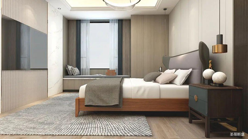 臥室精簡(jiǎn)有致,從質(zhì)感出發(fā),打造由內(nèi)而外的優(yōu)雅奢華感。背景墻、地板、地毯均擁有較強(qiáng)的肌理感,在加上金屬軟裝飾物調(diào)和,讓空間在低調(diào)內(nèi)斂的基礎(chǔ)上又不失時(shí)尚的高級(jí)感,飄窗進(jìn)階為溫馨的一角,閑暇時(shí),則可倚窗而坐,品一杯紅酒,感受生活中的愜意時(shí)光。