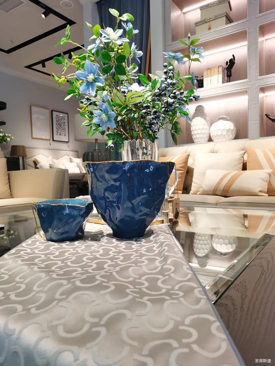 器口形狀各異,摒棄了傳統(tǒng)陶藝的方圓設(shè)計,引領(lǐng)中西結(jié)合陶藝的時尚特性,金邊鑲嵌,運用瓷器染色工藝,由深至淺洗染,以分明暗轉(zhuǎn)折。
