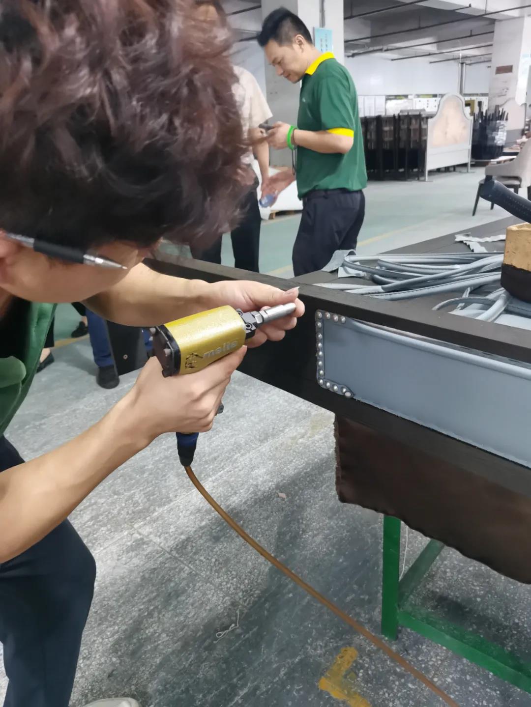 本屆技能競賽設(shè)置為工業(yè)組和商業(yè)組,共設(shè)競賽項目8項,其中,工業(yè)組競賽包含了打滾邊、打銅釘、自身產(chǎn)品組裝、成品組裝、柜體噴底色、修色、板材開料等七大細項。商業(yè)組以組裝辦公臺、床頭柜為主。