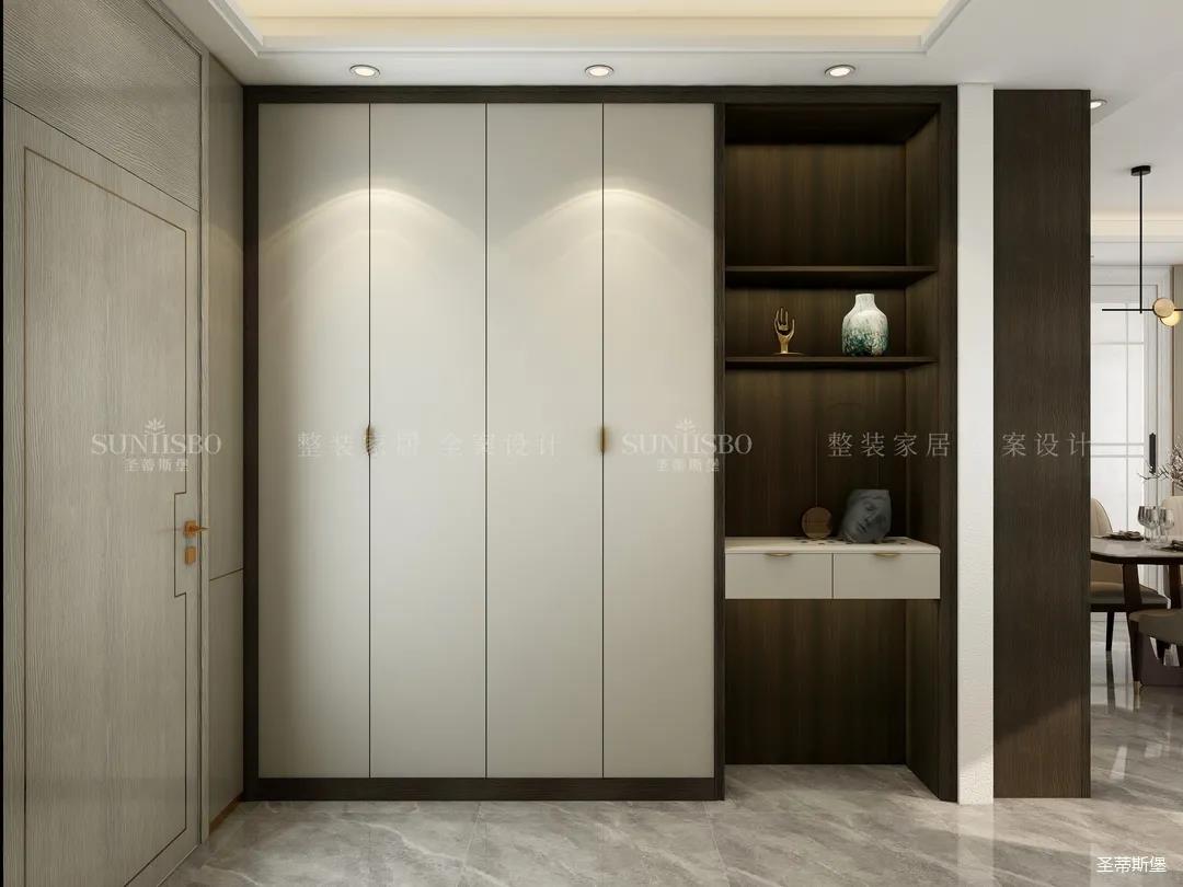 衣帽間采用了虛實(shí)結(jié)合的設(shè)計(jì),構(gòu)筑起規(guī)整而有序的置物區(qū)域和功能齊全的收納系統(tǒng),煙熏色實(shí)木作為空間的主要元素,環(huán)抱著整個(gè)衣帽間,張揚(yáng)又不失沉穩(wěn),恰到好處地搭配金屬玻璃置頂高門和感應(yīng)燈光系統(tǒng),挑高了空間效果,也詮釋著現(xiàn)代極簡線條美感和對(duì)極致的生活追求。
