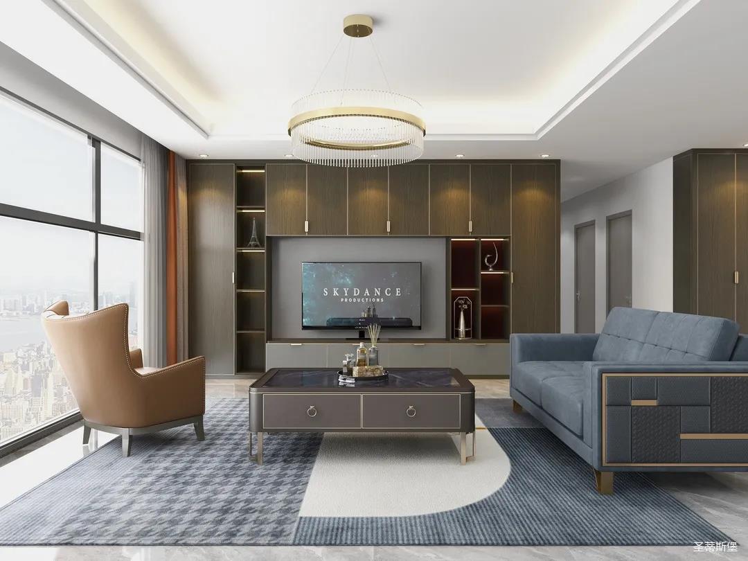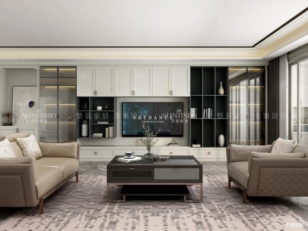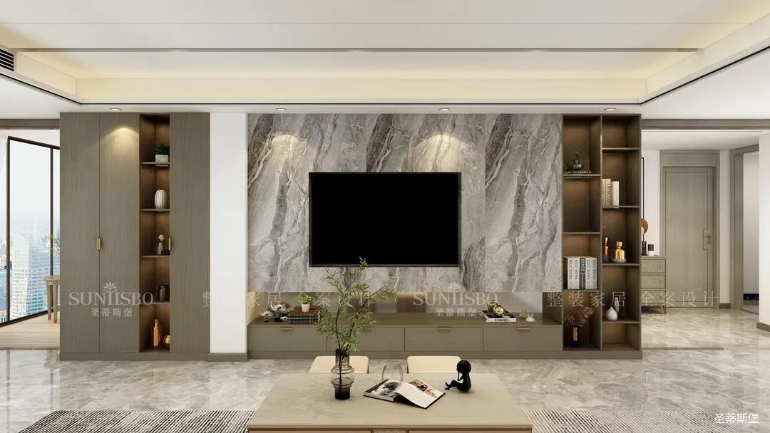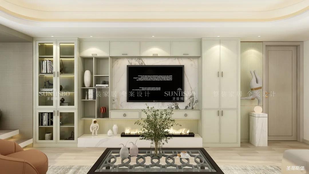 它以英倫爵士灰為柜體主調(diào),背景墻定制了整墻的儲(chǔ)物柜,色調(diào)懷舊復(fù)古的同時(shí)還夾帶著時(shí)尚摩登氣息,明暗收納合理分區(qū),電視被實(shí)木飾面包圍,使空間視覺得以延伸,美觀收納兩不誤。