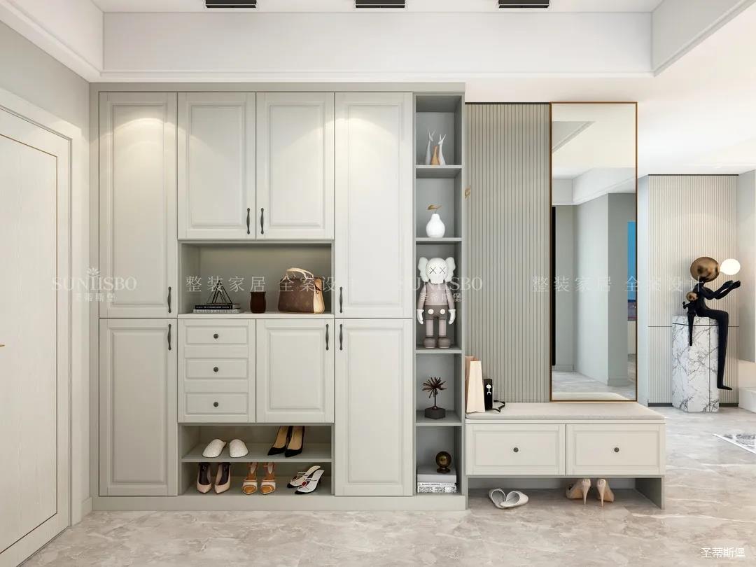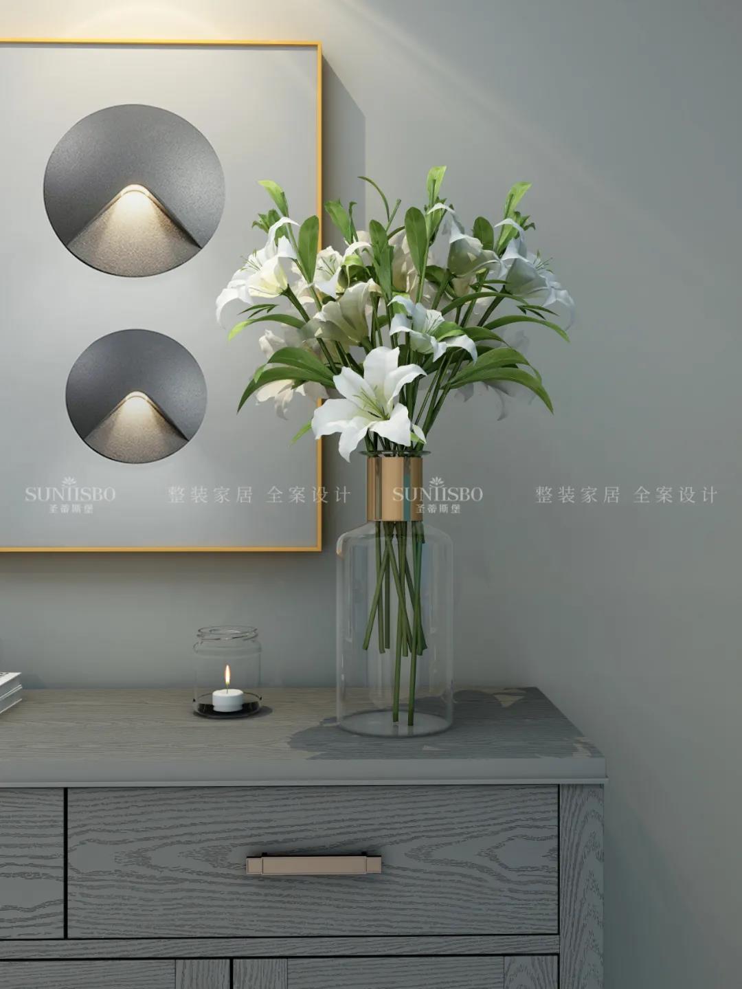 入戶側(cè)面設(shè)計(jì)一字型玄關(guān),腰部,底部留空做層板,便于隨手放置鑰匙、鞋包等物品,中間留空設(shè)計(jì)為開放展示區(qū),加上軟裝飾品點(diǎn)綴,達(dá)到業(yè)主對品質(zhì)生活追求的理想狀態(tài)。應(yīng)女主人要求,玄關(guān)還加長延伸出妝鏡和換鞋凳,讓動線自然流暢。