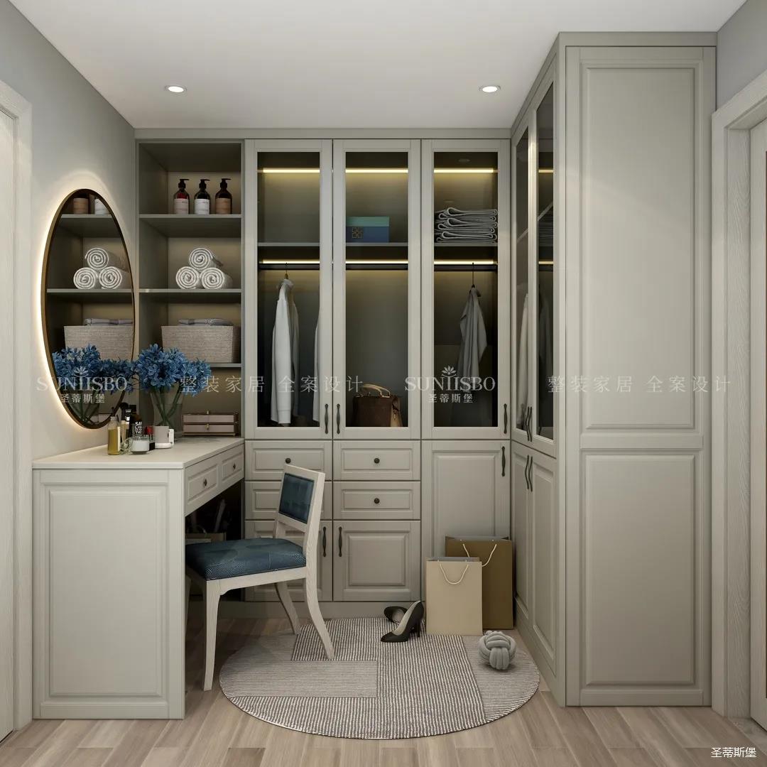 利用主臥多出來的小空間,設(shè)計(jì)打造出步入式衣帽間。定制了L型的轉(zhuǎn)角衣柜,提供了超強(qiáng)的收納空間。圓形的裝飾地毯與妝鏡相呼應(yīng),彰顯著空間女主人對精致生活的態(tài)度。