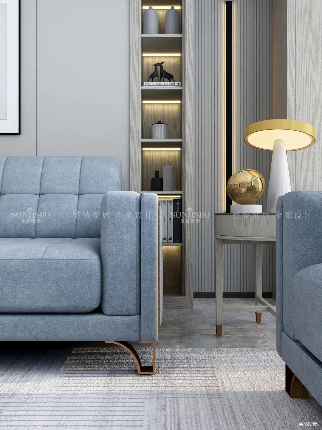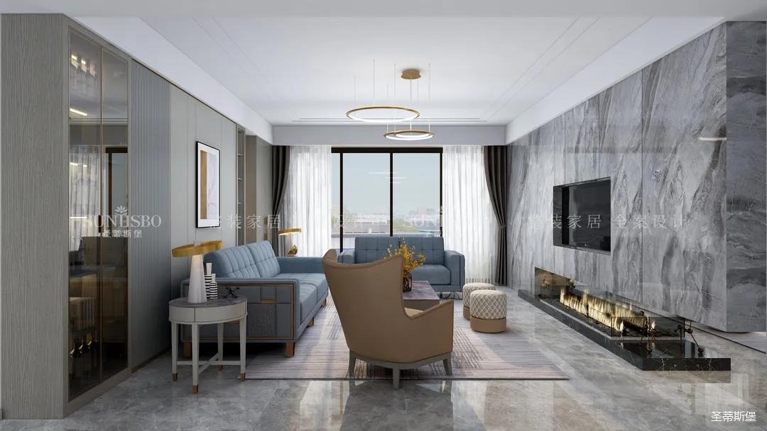 精細(xì)結(jié)構(gòu)下沙發(fā)角幾的微金屬結(jié)構(gòu),干凈利落,彰顯質(zhì)感。整面大理石背景墻將電視設(shè)計為壁龕結(jié)構(gòu),底部的裝飾壁爐讓家的溫馨感再度升級。