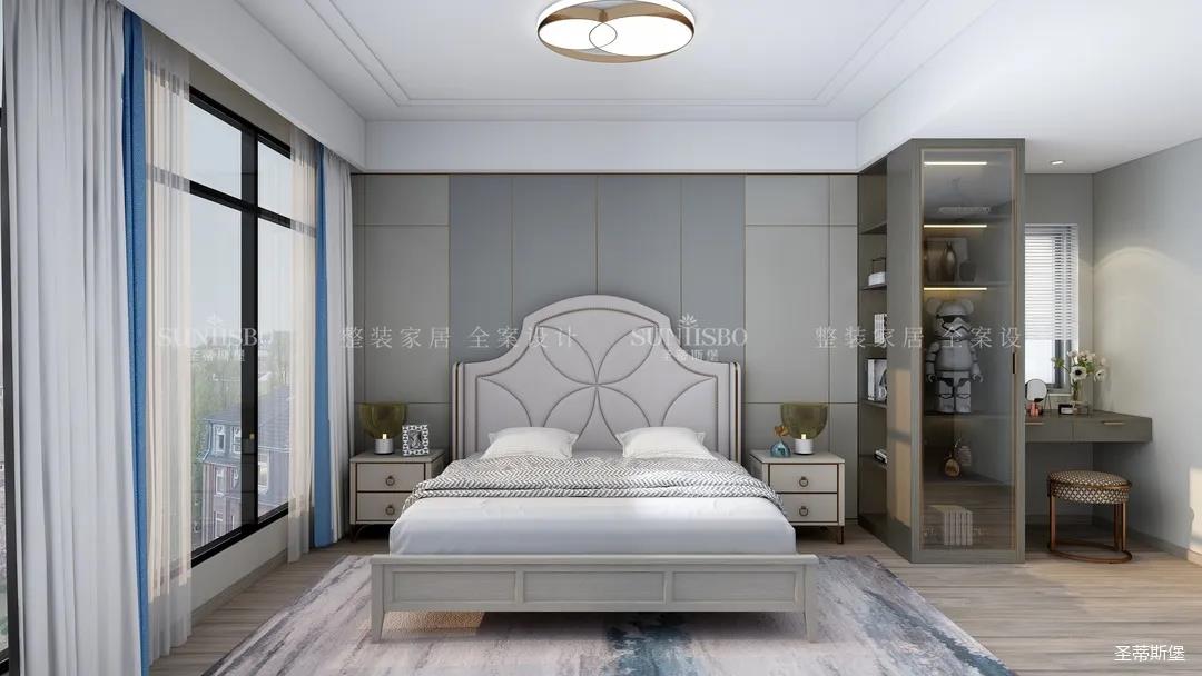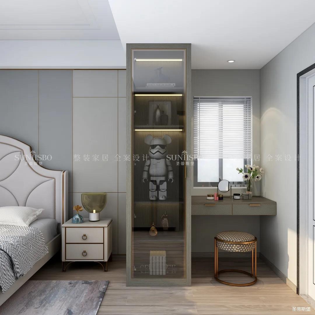 主臥的設(shè)計,整體風(fēng)格與色調(diào)的一致,通過空間設(shè)計與軟裝細(xì)節(jié)的調(diào)控,顯得主臥多了一份寧靜與放松。四照花床屏的細(xì)節(jié)、材質(zhì)色彩的把握、隔斷小書桌的設(shè)計,無不體現(xiàn)著設(shè)計師獨(dú)特的品位和全案設(shè)計的能力。