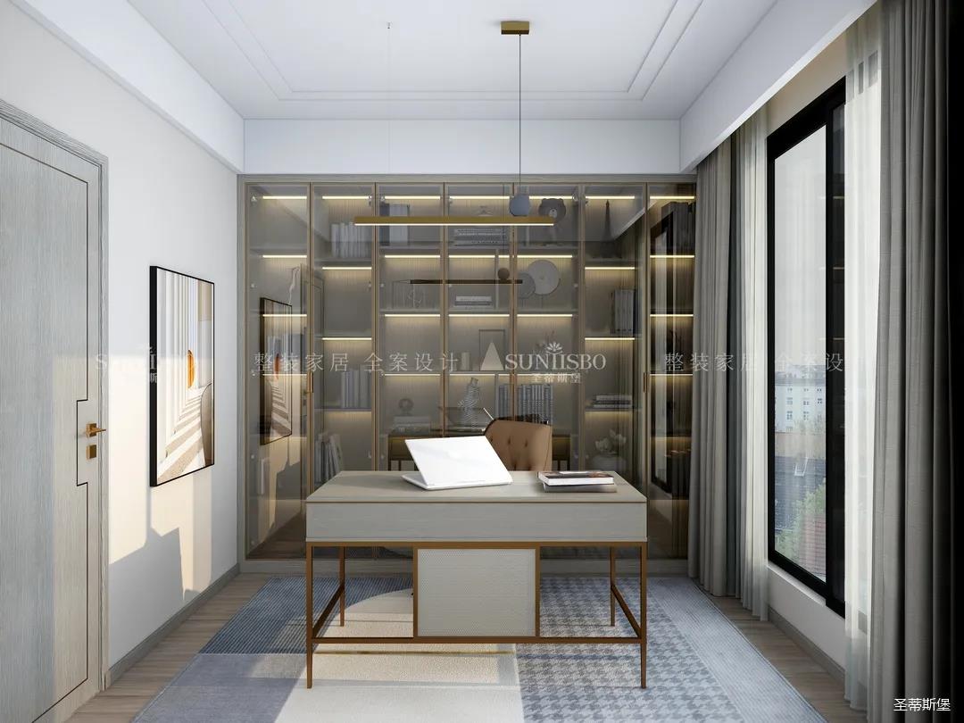 書房在陽光下襯得通透自然,半透明的灰玻利用高級且親和的色彩貫穿著柜體與空間的互動,溫潤的木質(zhì)、輕奢的金屬以拼合的狀態(tài),將屋主感性與時尚的生活理念滲透進(jìn)書房空間。不同材質(zhì)的搭配為空間增添平衡感,使得緊繃的工作狀態(tài)得到放松。