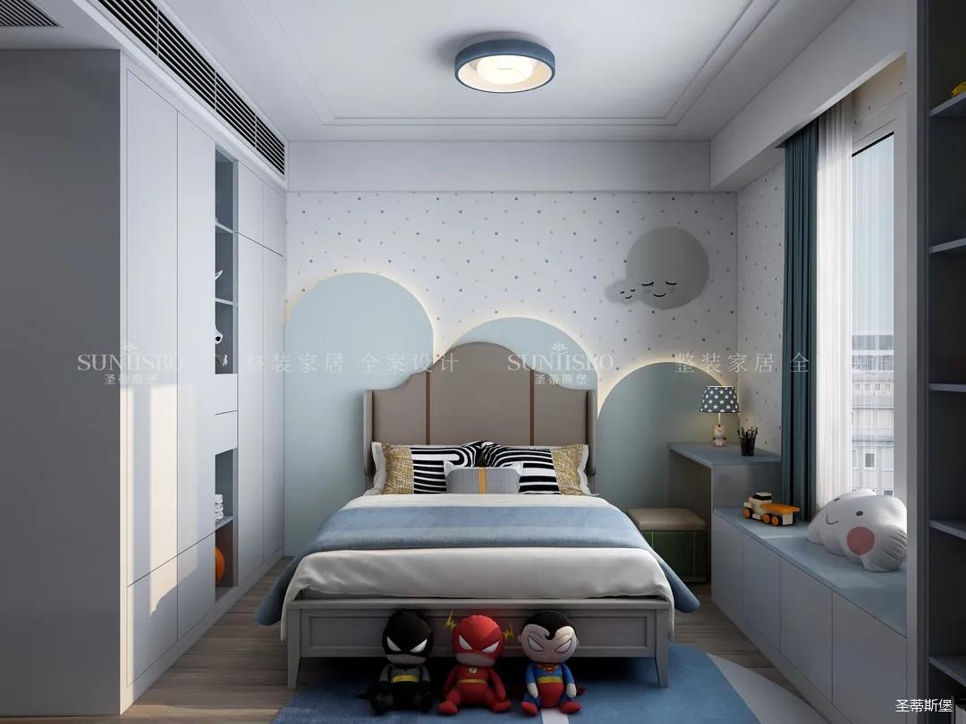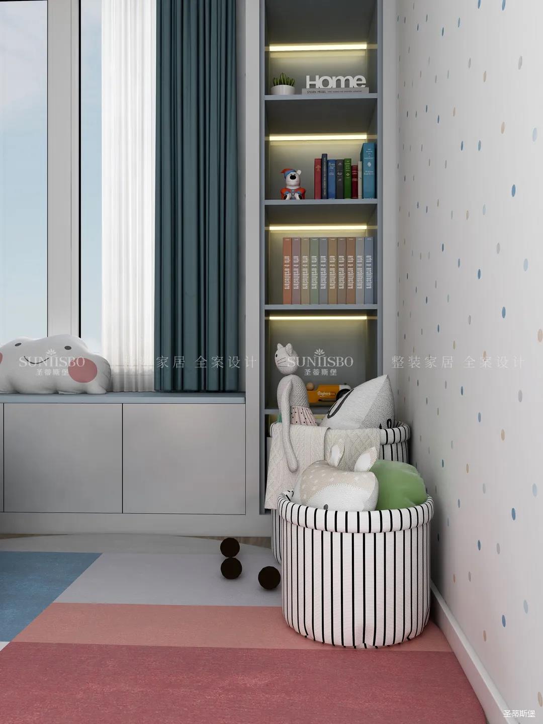 兒童房追求的是童真與自然,柜體的色彩與軟裝搭配完美呼應(yīng),云朵山峰的背景墻,以特立獨(dú)行的設(shè)計在視覺上讓心靈得到放空的意境。沿窗打造的飄窗格局,增加空間的功能性,造型簡約的柜體根據(jù)家裝理念摒棄了繁復(fù)的設(shè)計,更多展現(xiàn)的是空間自然之美。