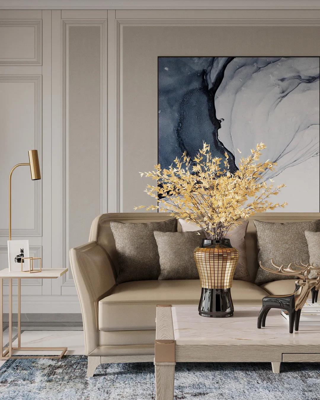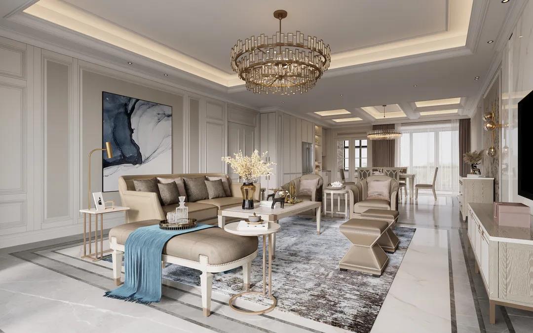 本案定位美式輕奢風(fēng)格,設(shè)計(jì)師提取了業(yè)主喜歡的顏色添加至空間中,并運(yùn)用金屬元素滲透到每一個空間,統(tǒng)一色調(diào)。在設(shè)計(jì)上,格局大而不空,以優(yōu)美線條雕琢空間語言,材質(zhì)肌理間的碰撞融合,打造出層次豐富的藝術(shù)感。