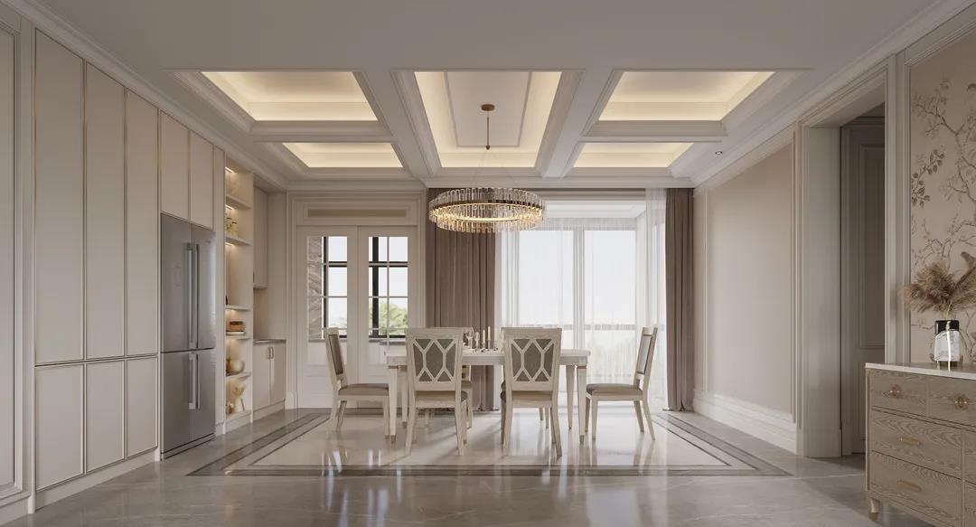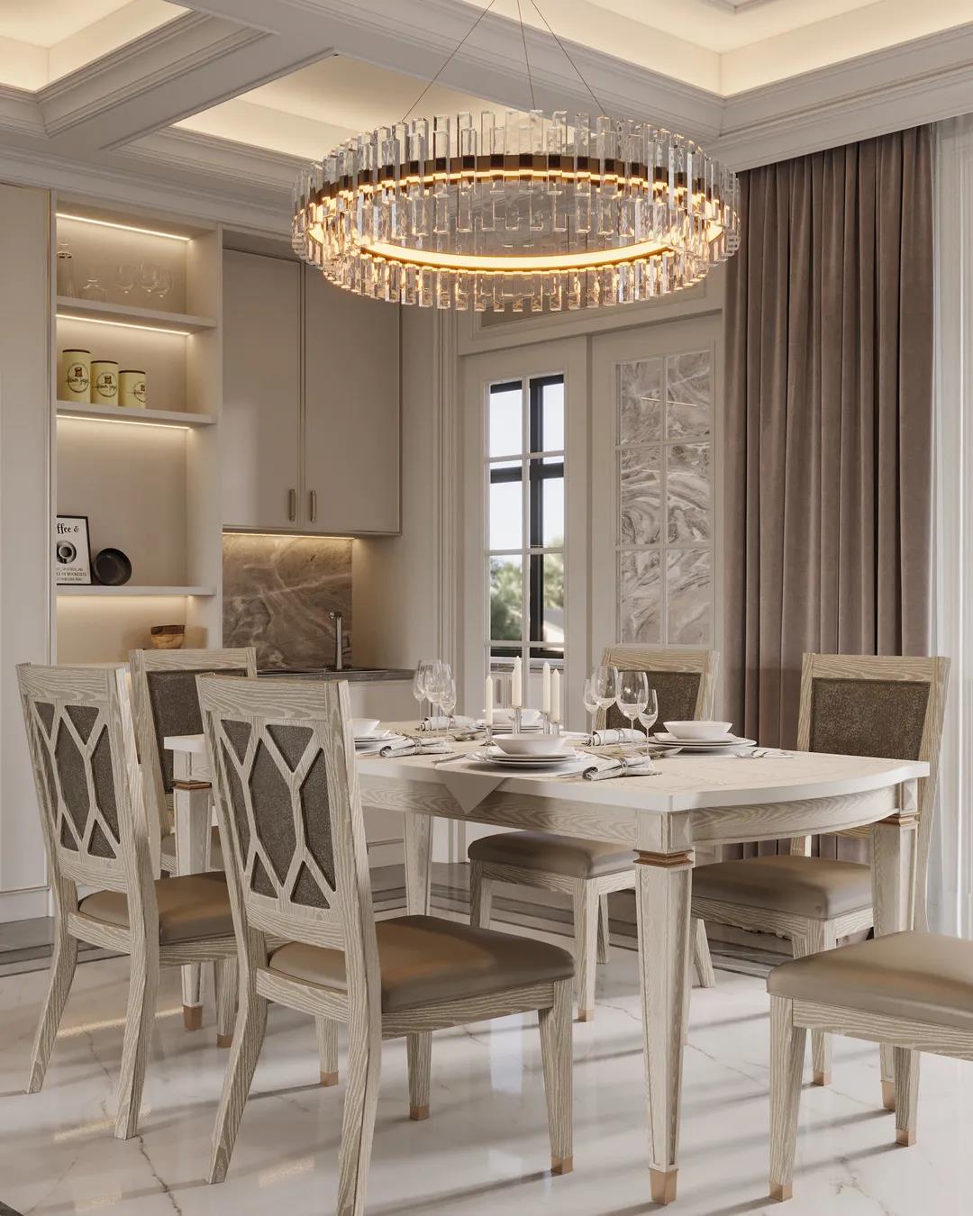 在華麗而精致的餐廳中,仿古白的餐桌椅搭配通透的水晶高腳杯,兩者交相輝映,用餐儀式感十足。墻面的護(hù)墻板和酒柜呈現(xiàn)一字型設(shè)計(jì),一方面增添空間整體的豐盈感,還強(qiáng)調(diào)出個性現(xiàn)代的輕奢布局。